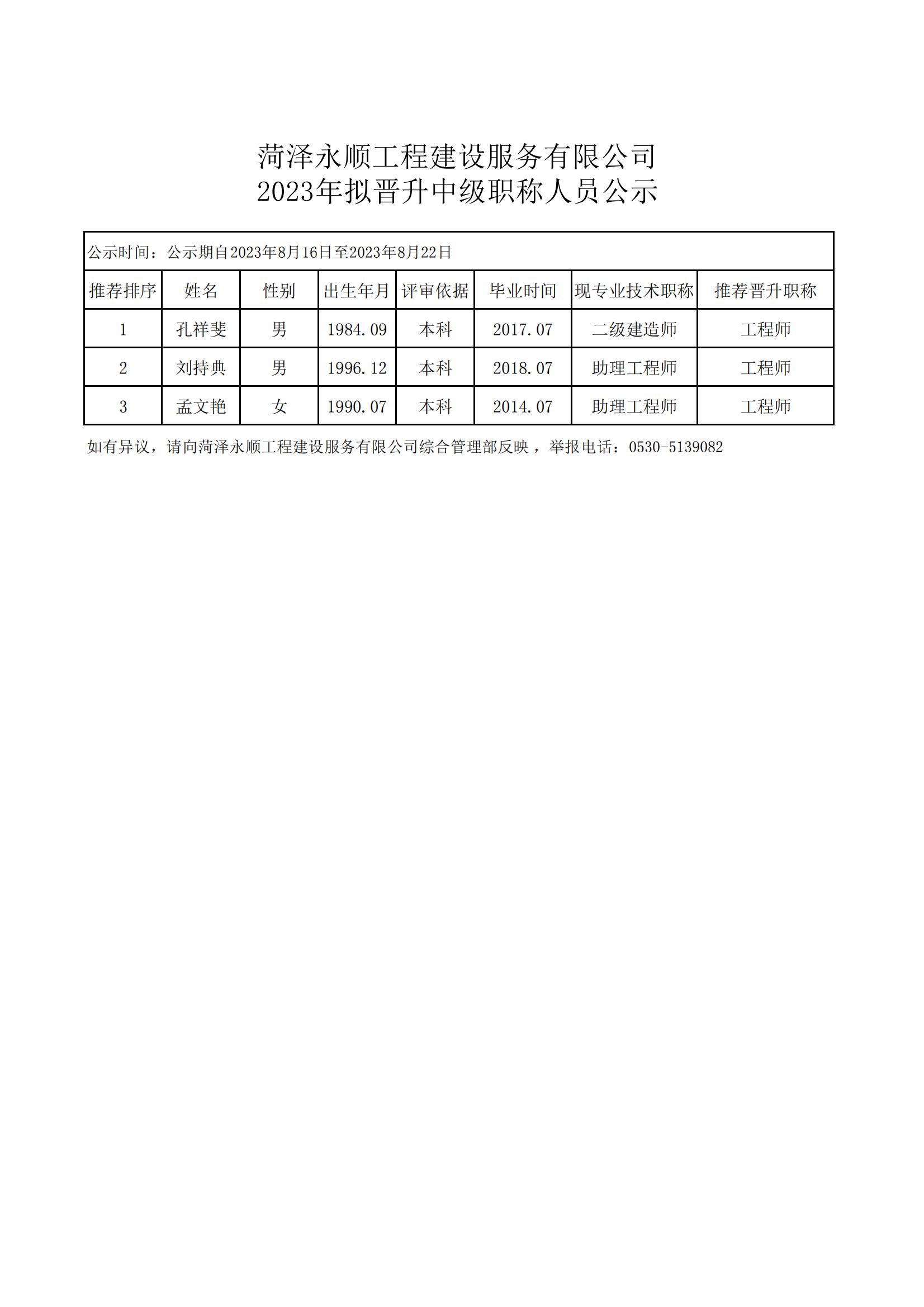 菏澤永順工程建設(shè)服務(wù)有限公司 2023年擬晉升中級職稱人員公示