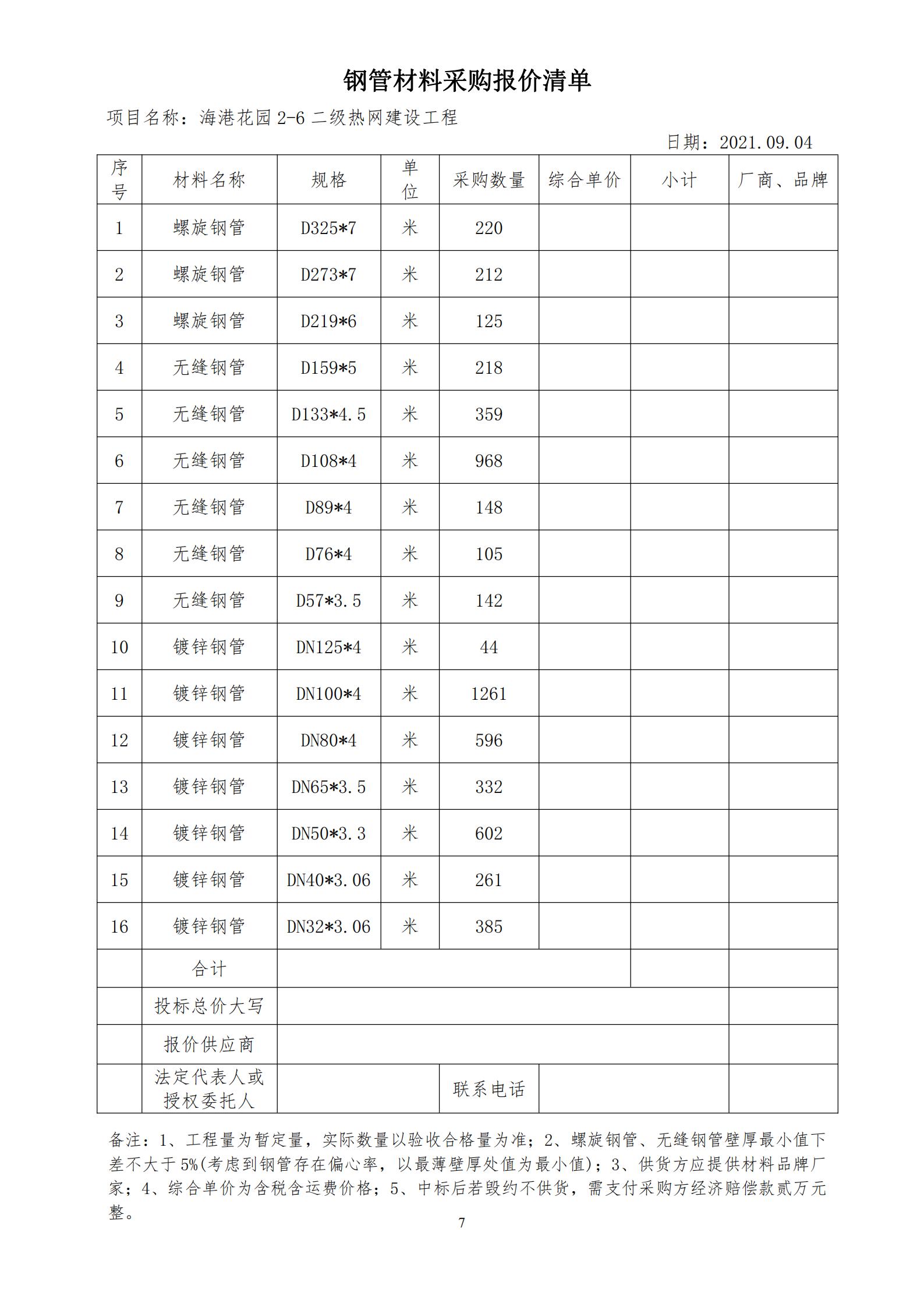 1.材料采購(gòu)內(nèi)容:海港花園2-6二級(jí)熱網(wǎng)建設(shè)工程用鋼管,具體規(guī)格要求、數(shù)量詳見(jiàn)材料報(bào)價(jià)清單。